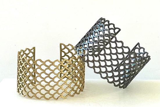 Cuff BraceletsScallop motif and open wire work shown on brass and rhodium plated cuffs