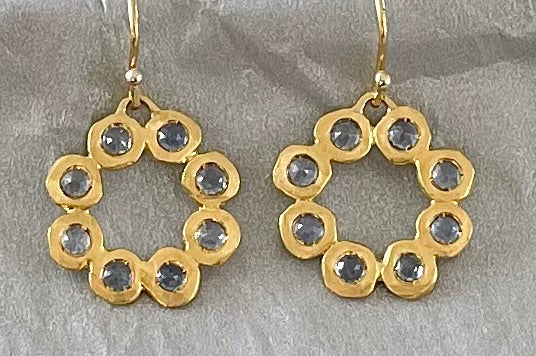 Round Drop EarringsIrregular discs are connected to create 18k gold earrings with sapphires