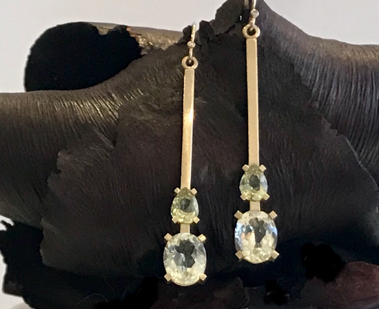 Elongated Drop EarringsGreen beryl and Mali garnet stones set in 10k gold
